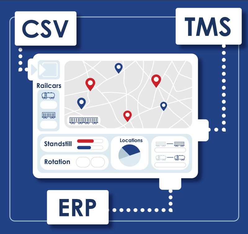 Push data to Ovinto by sending your shipment data via CSV or connect your TMS/ERP to visualize the exact standstill time and location of each railcar or container in real time.